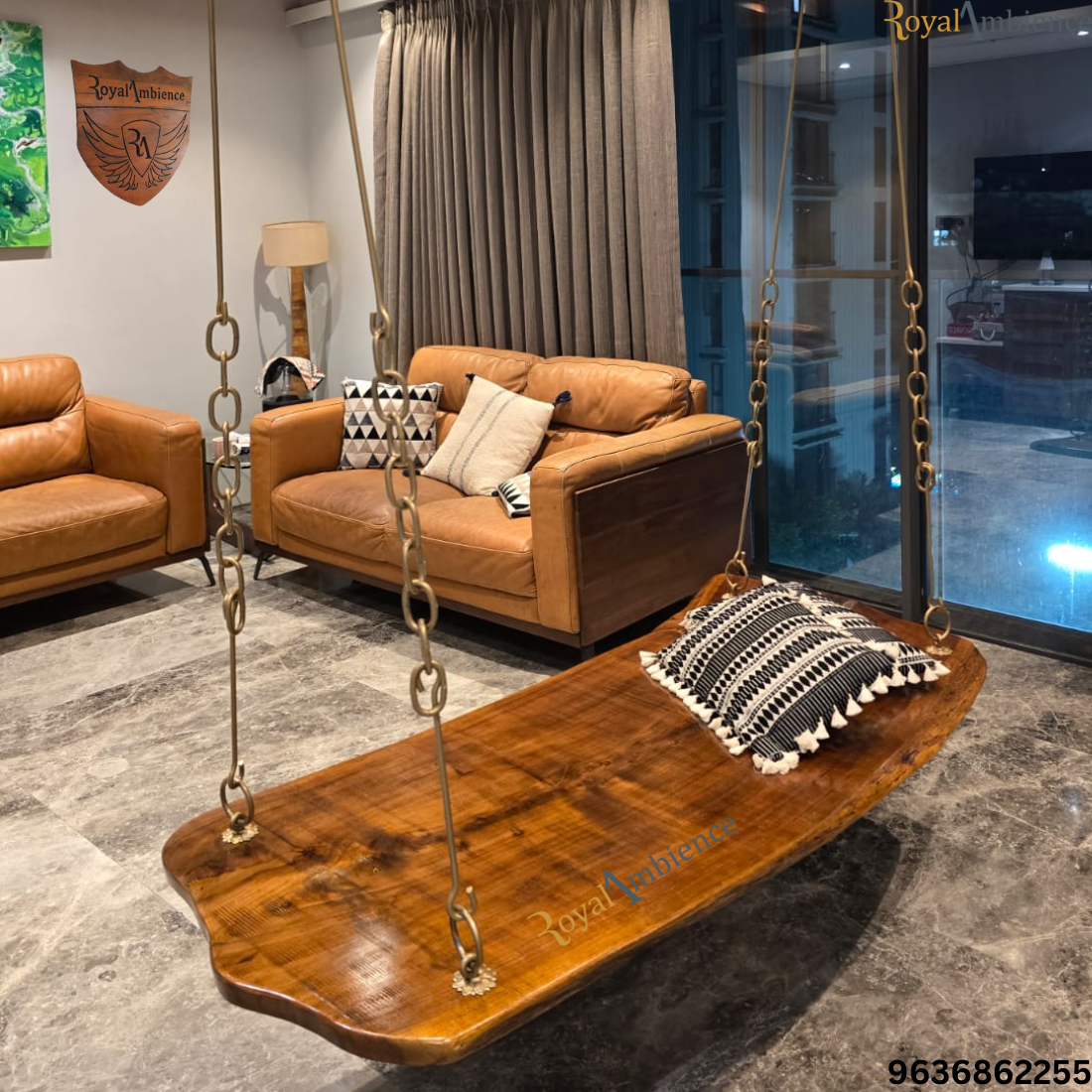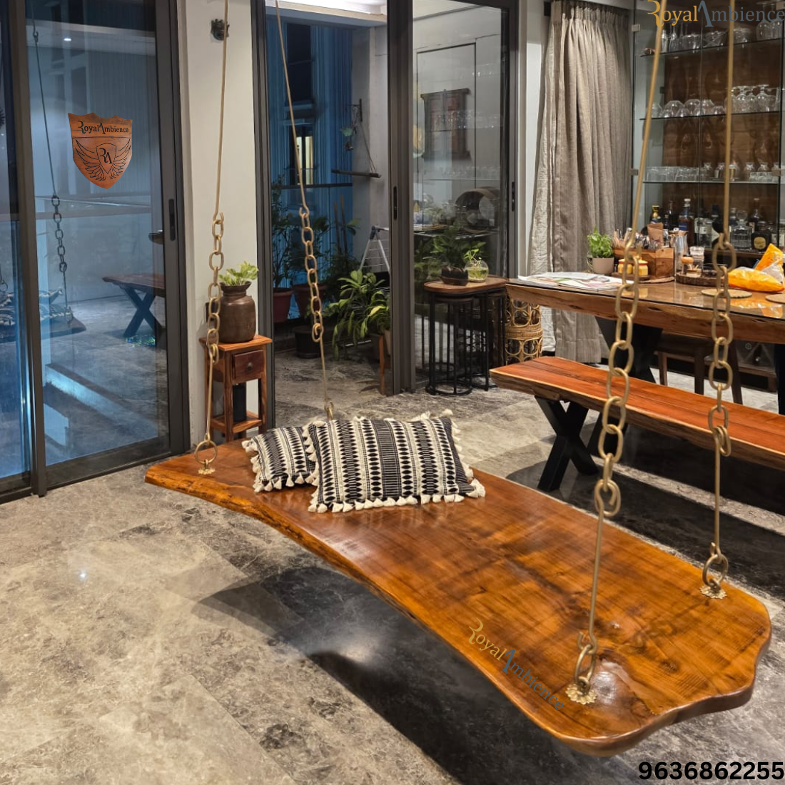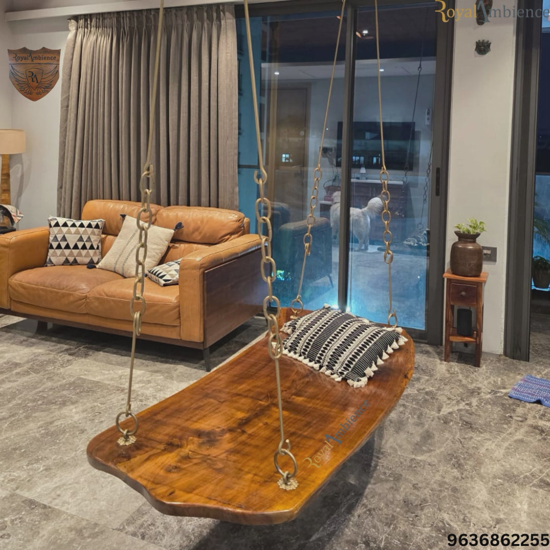 Elevate your indoor space with our Live‑Edge Single‑Plank Swing—a striking blend of raw natural beauty and expert craftsmanship. Handcrafted from a single premium solid wood plank, this swing retains the organic shape and live edge of the original tree, ensuring each piece is utterly unique. Built to last, it offers a comfortable, inviting seat perfect for relaxation on your porch, balcony, or Living room. Made with care by seasoned artisans, it brings rustic elegance and nature-inspired character to your home.